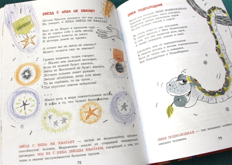 Сынок у меня любитель поумничать - он специально вычитывает какую-нибудь идиому, разбирается в ее значении и пытается вставлять в речь (конечно, пока с переменным успехом). Иногда, как в словаре, ищет значение слов, сказанных мною. А часто просто листает книгу, которая теперь постоянно живет где угодно, кроме полки.