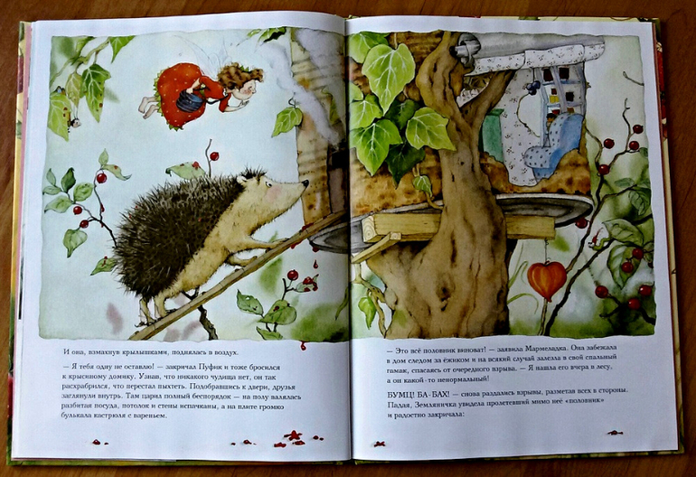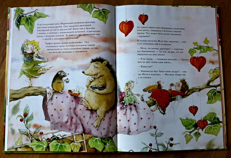 Помимо доброй и интересной истории главное достоинство книги - милейшие иллюстрации. Отличное качество печати передает всю красоту рисунков. Цвета в книге яркие, но нежные и немного приглушенные, что совсем не утомляет глаза и позволяет долго, с удовольствием их рассматривать.