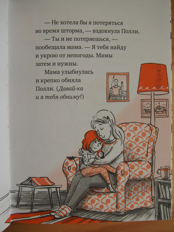 «Полли и Нейл» взяла одну книгу на пробу про шторм. Весной читали библиотечную книгу Поляндии «День, когда я встретил кита» и тогда сын очень переживал о папе мальчика. Но «Полли и Нейл» не вызвали у сына переживательных чувств, сначала книгу он воспринял холодно. Она все таки нам тоже рановата по возрасту. Сейчас книга читается лучше, сын очень любит разворот, где мама обнимает Полли, я его тоже все время обнимаю. И его очень заинтересовал разворот с посетителями кафе, которые ждут своих родных и близких. Сын все время спрашивает, кого они ждут) В общем, по книги есть, что обсудить с ребенком.