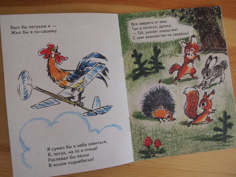 И еще мы читали забавные стишки Сергея Погореловского «По-своему». Где мальчик все бы делал по-своему, будь он зайцем, медведем, петухом и ежиком. Раньше мне казался формат страничек-невеличик очень маленький, а оказалась, что невеличка такая уютная и ее так приятно держать в руках! Брать в дорогу невеличку очень удобно! Теперь хочу еще парочку книжечек из серии.