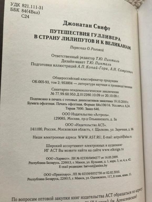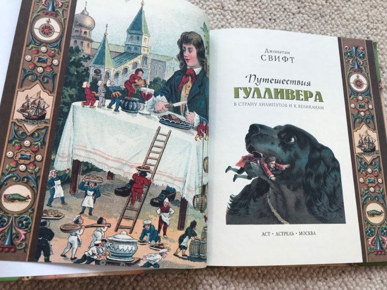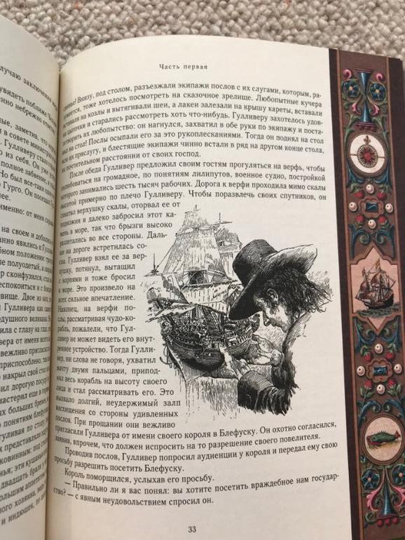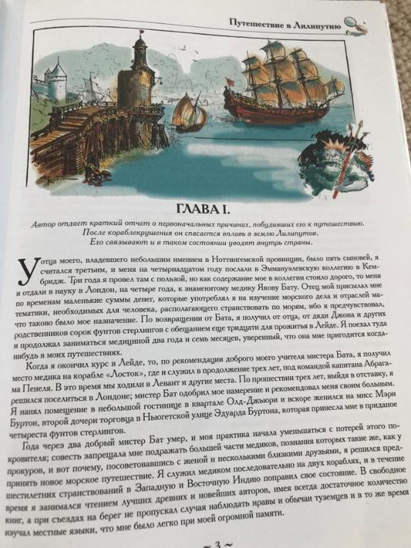 И четвертая книга это Путешествие Гулливера. В моей библиотеке есть,как классическое полное произведение, так и краткий пересказ. Тяжело оценивать , так как это на мой взгляд интересное произведение, дающая полет фантазий и желание оказаться в роли главного героя. Перевод и подача пересказа , мне понравилась.Читается на одном дыхании, плюс дополняют не мало важные в этом произведении иллюстрации как цветные, так и черно-белые. Сама книга удобного формата, но шрифт как и в первой книги мелковат.Листы довольно плотненькие, с приятным молочным отливом.