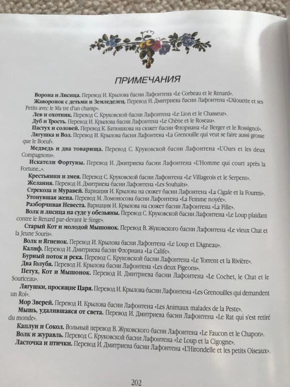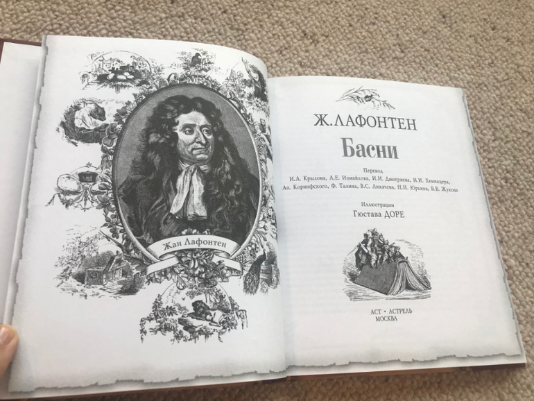 Ж.Лафонтен в историю литературы вошел как бессмертный баснописец.Басня в той форме, которую ей придал писатель, - одно из счастливейших творений человеческого ума.Его басни очаровывают прежде всего своей жизненностью;иллюзия полная:она была пережита автором, а потому внушается и читателю.Хотя следует заметить , что писатель не выдумал не единой своей басни., а все заимствовал, но предал басням характерный окрас. Ниже приведу сравнения с другим Сборником Басен от АСТ с ил. Ж.Б.Удри и Ч.Робинсона. В конце каждой книги приведен список откуда и у кого позаимствована Басня. Все понятно и логично.
