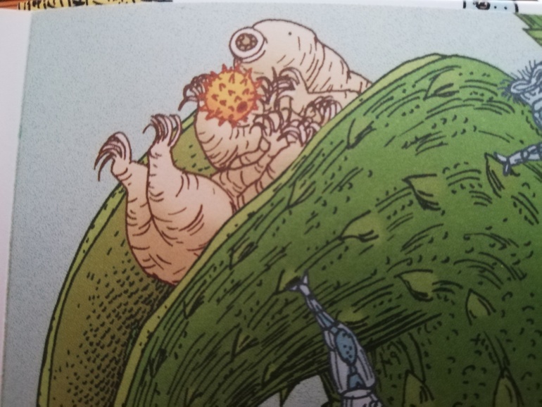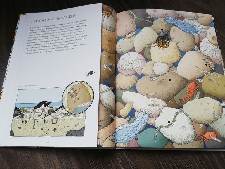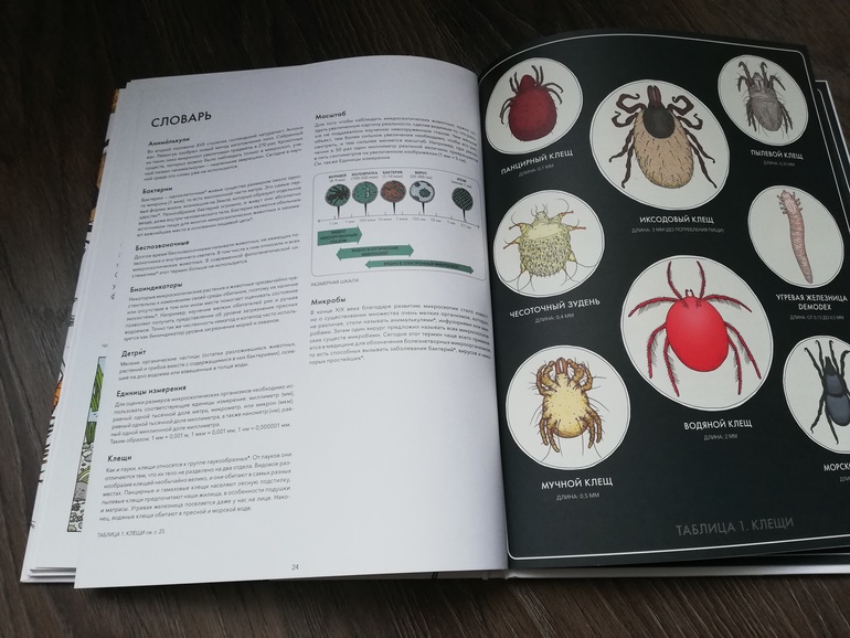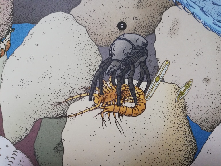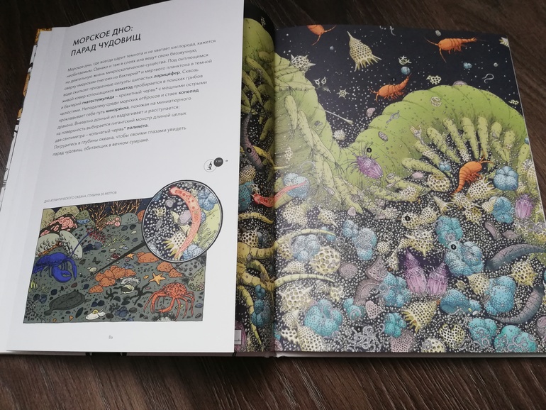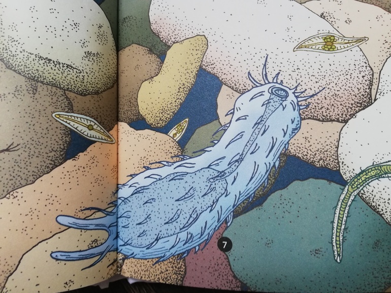 морское дно, дом (постель и кухня), кожа, лесная подстилка, лесной мох, лужа обыкновенная, река. К каждому развороту написано краткое предисловие и краткая информация по микроорганизму. Очень понравилось, что указаны размеры каждого существа и произведено масштабирование. Кстати, большинство существ, представленных в книге, безобидны. Но как-то сложно поверить в безобидность вот этого существа