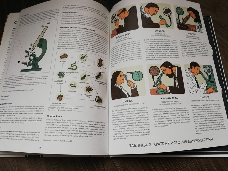 Книга увеличенного формата. Страницы с разворотом, на развороте указаны представленные на изображении существа и их размеры и описание. В конце книги есть словарь с терминами, хотя мне лично удобнее сноски внизу страницы. Также есть история создания и усовершенствования микроскопа, от увеличительного стекла до электронного микроскопа.