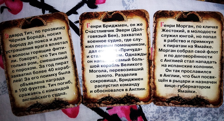 Много вопросов вызвали правила карточной игры. Много однотипных заданий: "положи карту в колоду", "возьми из колоды" и т.п. Игра не очень веселая, нужно как-то обыгрывать ее. Вобщем, этот момент с карточной игрой разочаровал. На обороте карточек информация о конкретном пирате.: