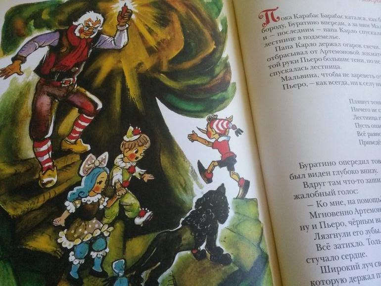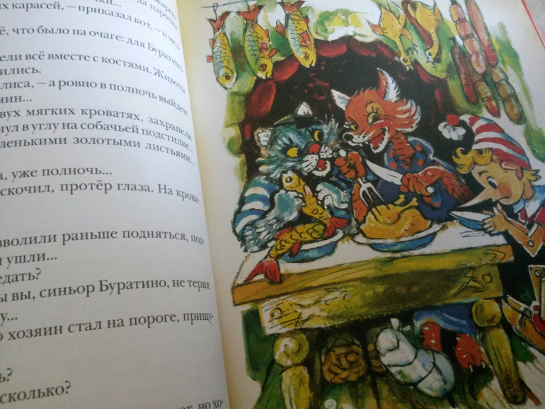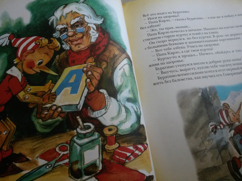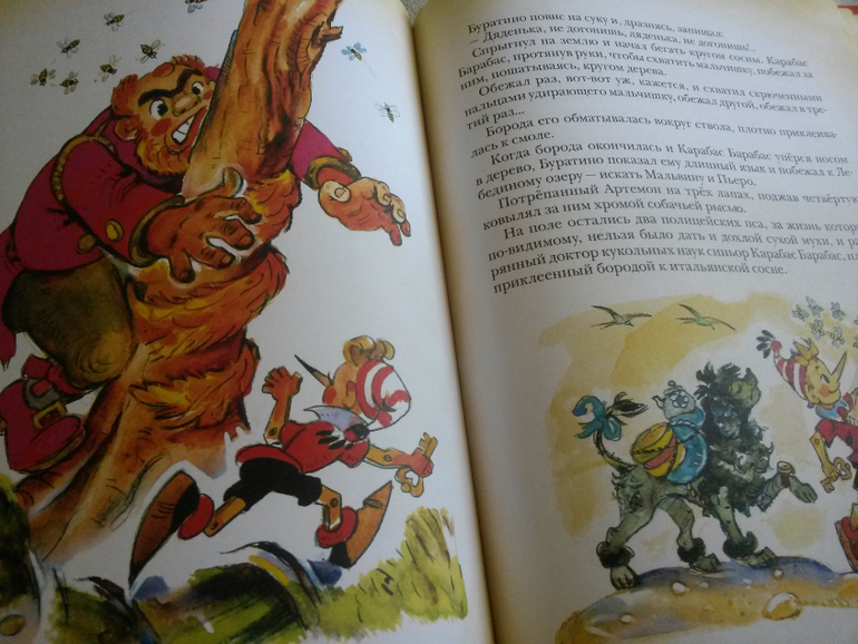 У нас издание с Владимирским, где иллюстрации на каждом развороте. Ее сейчас, по-моему, нет в продаже. А когда покупала, понравилось, что в книге собраны все иллюстрации Владимирского к Буратино. Иллюстраций действительно очень много! Единственный минус, пожалуй, в том, что, поскольку были собраны все иллюстрации Владимирского, иногда в книге они идут как бы вразнобой. Мальвина, например, на разных страницах может поменять платье: сначала она в одном, потом в другом, потом снова в первом. Но для Мальвины, пожалуй, это простительно)))) Так что книгой в целом довольна)