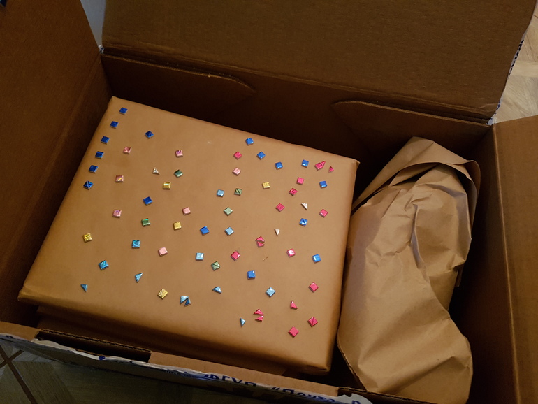 Когда мы её вскрыли, он сказал что это наверное от Деда Мороза)), так как из коробки на нас сияла россыпь блестящих стикеров)).