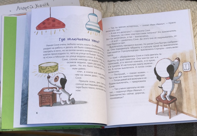 Честно говоря, я не очень большая поклонница творчества Усачёва) Умная Собачка Соня у нас появилась года в 3-3,5, я не стала её читать дочке, тк посчитала, что в данном возрасте ребёнок не может понять такого юмора..Ннапример, засунуть хвост в розетку... это не очень смешно и особых предостережений от таких действий там не написано.. или плеваться косточками с балкона.. и др. короче, я была не в восторге от книги. это лично моё мнение. В этом году дочка сама вспомнила эту книгу, тк какое-то время книга присутствовала в книжном шкафу)) и очень просила послушать хотя бы аудио. Я решила купить обе книги. Считаю, что именно в этом возрасте юмор этот понятен полностью. но в книге Знаменитая собачка соня меня напрягла одна глава (Любовь), я даже не стала ее читать. считаю её неуместной для детской книги.