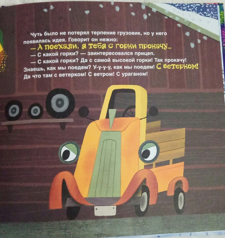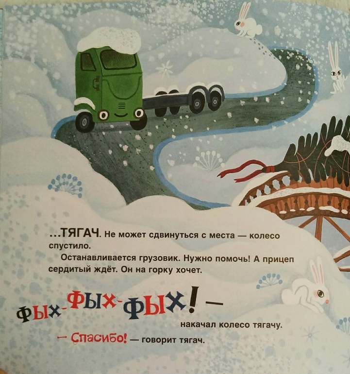 и в машине папиной первым делом включаем) а сколько было счастья, когда в музее можно было потрогать дворники у огромным грузовиков, пожарных машин, а некоторые еще и подвигать ) ребенок просто дар речи от счастья потерял) а я люблю эти книги за то, что они ненавязчиво побуждают присмотреться к своим собственным взаимоотношениям с детьми! Потому как Грузовик с прицепом это никто иной, как Взрослый и Ребенок! В третьей, новогодней части, перед нашими друзьями стоит непростая задача, раздобыть елку к новому году и привести ее на главную площадь! Но для этого для начала нужно проснуться и разбудить младшего )