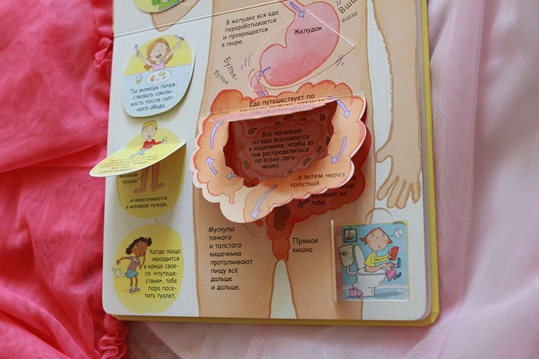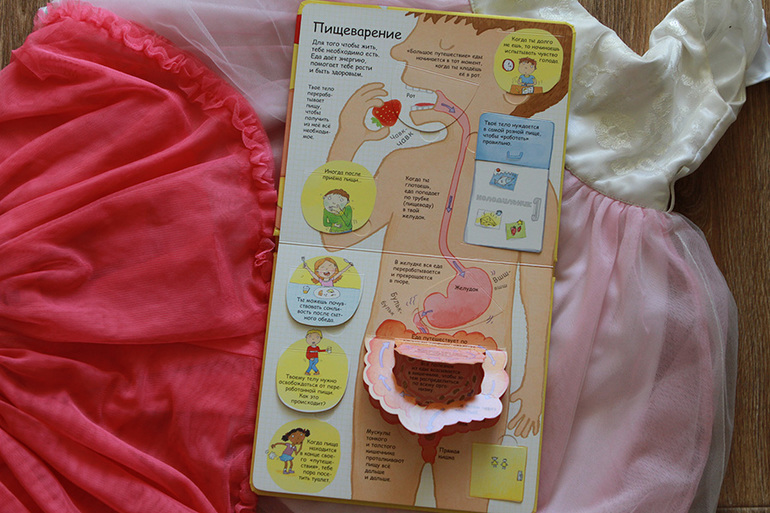 Тело человека, картонка Usborne/Росмэн. Стал повторяться вдруг вопрос про кишечник. Где он, а где легкие. Эти вопросы сподвигнули меня купить давно желаемую книжку ) Красавица, а не книжка, картонка, с клапанами, Usborne )) Книжка востребована, но не вся, смотрит дочка по кусочкам, так что думаю еще на вырост, будет смотреться долго. Знаете, так мило мой портрет рисует дочка. Длинные ноги-палочки, сверху сразу же волосы струятся вниз, а вверху справа, где-то неподалеку нечто скрученное - это мамин кишечник ))) Подозреваю, что тема всплыла потому что мы с мужем уже который месяц читаем/мучаем книгу «Очаровательный кишечник»))