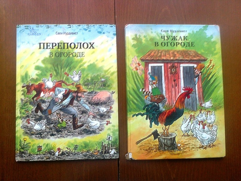 В начале сентября отправились в библиотеку, и еще по дороге Даша меня попросила взять Финдуса и Петсона. В наличии были четыре книги, ребёнок выбрал эти две. Книги Свена Нурдквиста были у нас в хитах два года назад, «изгрызли» их вдоль и поперёк, и с тех пор Даша периодически о них вспоминает, и тогда берём в библиотеке одну-две книги, правда, они частенько «на руках», но всё же на полочке обычно что-то да стоит.