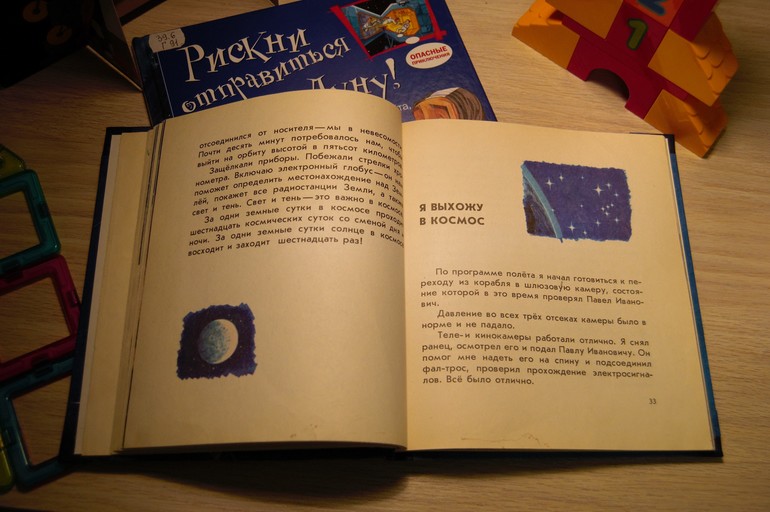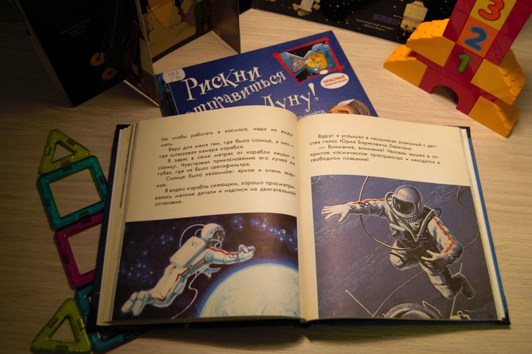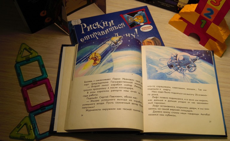 Нужно начать с того, что такая книга у меня была в детстве. И как же я жалею, что она пропала. Ведь еще помню ее на полке, когда я уже взрослая была, а потом исчезла. Видимо, ее отдали кому-то с концами... Как долго я рассматривала эти замечательные иллюстрации, которые нарисовал сам Леонов: восход солнца в космосе, человек в скафандре, тренировки, космический корабль. Ну уж об обеде космонавтов, это, конечно, вообще отдельная история. Попробовать еду из тюбиков... эх.. мечта всех детей Советского Союза. И вот я читаю ее своей дочке. Честно сказать, я пыталась ее прочитать так, чтобы она понравилась, в тоже самое время я пыталась беспристрастно оценить ее (без налета "ах, она из моего детства, а в детстве, все знают, все кажется прекрасным"). Конечно, она написана для детей и в ней нет подробностей о трудностях, какие возникли в этом полете. Но написана она прекрасно! Она написана человеком, который это сделал, это прочувствовал, это его эмоции, без ненужного пафоса, но о главном. "В космосе жить и работать можно!" Выйдет переиздание, обязательно куплю, потому что в энциклопедиях, которые у нас теперь в основном из иностранной литературы о космосе НЕТ упоминаний о Советском вкладе к космонавтику. Если мы сами это не сохраним, нам старательно подменят историю.