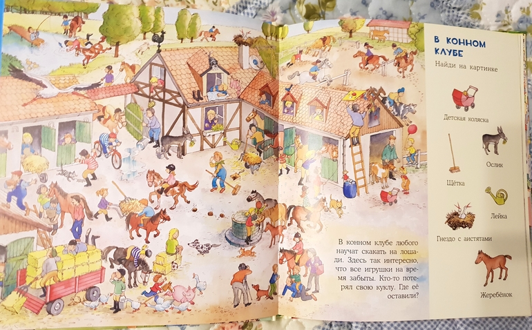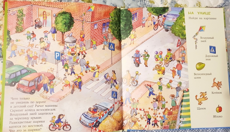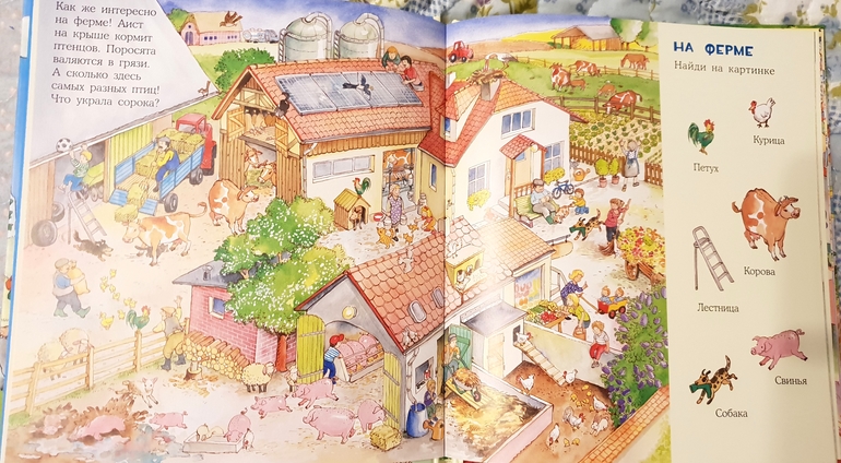 Мне очень жаль, что у моих детей не было таких книг. Это великолепный способ, не напрягая, в игровой форме развивать у ребенка наблюдательность. внимание, усидчивость. Но у меня появились замечательные двойняшки племянники, которым два с небольшим, и они очень любят эти книги. Прям не оторвать) Сегодня расскажу о самом бюджетном варианте, поскольку на фоне других Виммельбухов, эта цена просто подарочный вариант. Особенно, если учесть, что эта книга 2 в одном. Такой своеобразный перевертыш. Это одна сторона