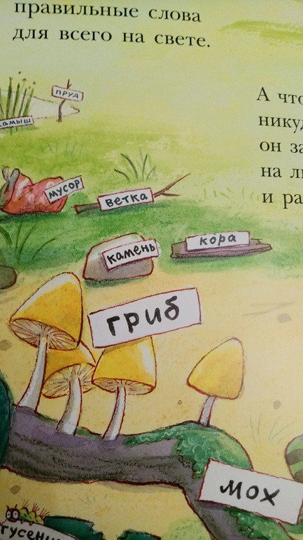и когда я увидела эти надписи, что это не просто книга для самых маленьких, это же отличная книга для первого чтения, вот так мимоходом, на развороте прочитать несколько словечек, ведь так интересно проверить, а правильно ли Кротик назвал гриб, камень или перышко.