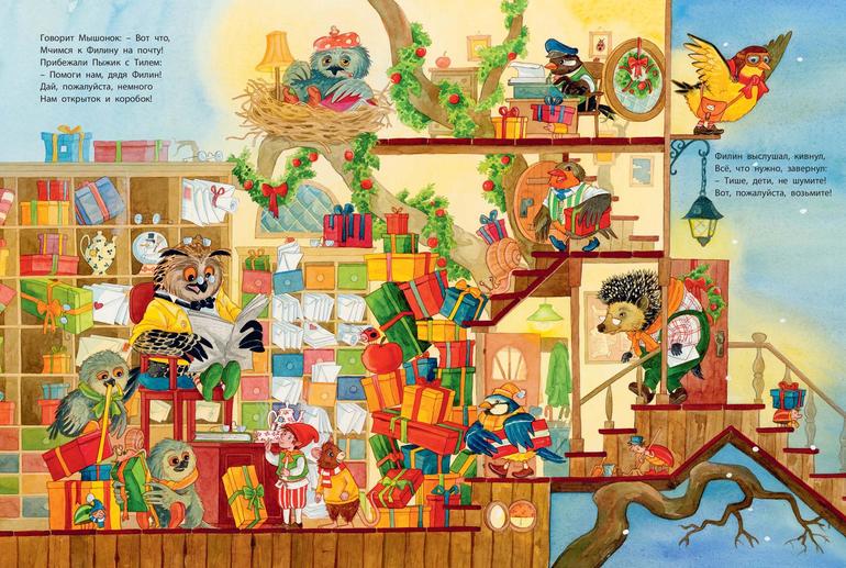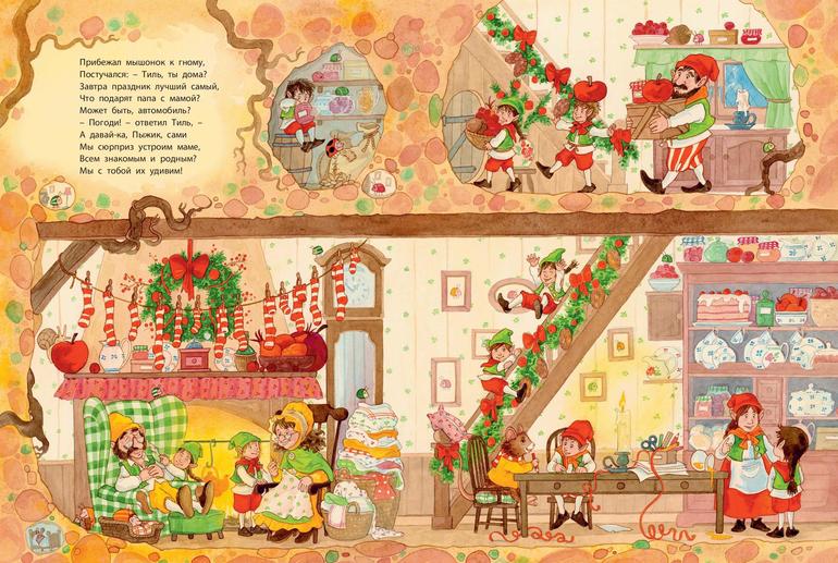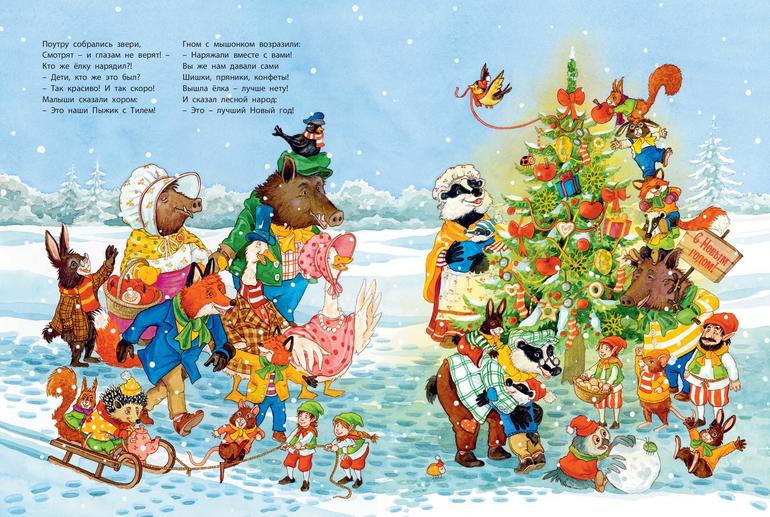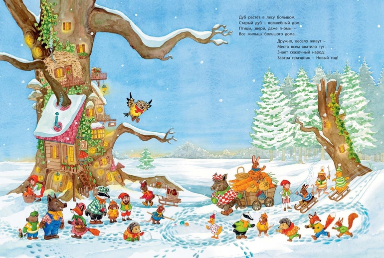 В волшебном старом дубе, в своих уютных квартирках живут самые разные звери, птицы, жучки-паучки и даже гномы. Двое весёлых друзей, гномик Тиль и мышонок Пыжик решили устроить необыкновенный новогодний праздник для своих соседей. Для этого им нужно побывать в гостях почти у всех обитателей дома, собрать множество забавных вещей и нарядить чудесную ёлку. Маленькому читателю будет интересно вместе Тилем и Пыжиком заглядывать в разные помещения волшебного дома, внимательно рассматривать его обитателей и находить на каждой картинке всё новые занятные детали.