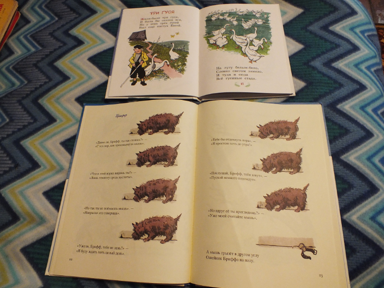 Картинок дублей у Лаптева в сбониках много.Но дело в том,что к ним другие стишата.И есть несовпадения.Например про Брифа есть в большом,в маленьком -нет.Про ежа мне тоже больше нравится из большого,и про мыошнка и масленка))Думаю потому,что он все же первый у нас появился.А обрезанной концовки у зайчат не заметила.С удивлением обнаружила продолжение в маленьком сборнике..
