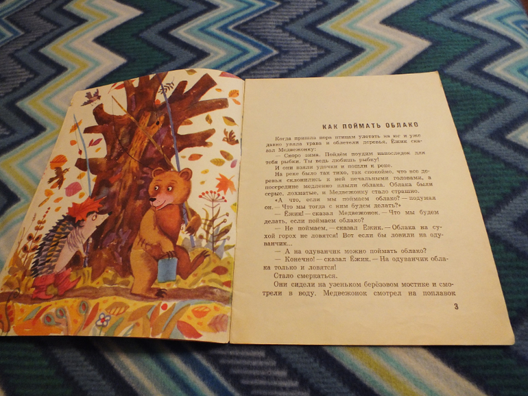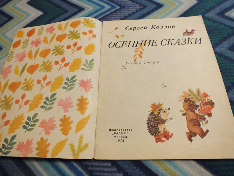 Сколько раз я начинала читать детям своего любимого Козлова про Ежика и Медвежонка.Но никак не заходил.Только сборник зимне-новогодних историй прочитали.Причем только про инопланетян запомнили.А это не самый интересный рассказ,на мой взгляд.А этот такой ярко-осенний.Выхватился из стопки и залпом прочитался.Очень филосовские сказки и неожиданные иллюстрации Диодорова.Опять же для меня.я не узнала его здесь.