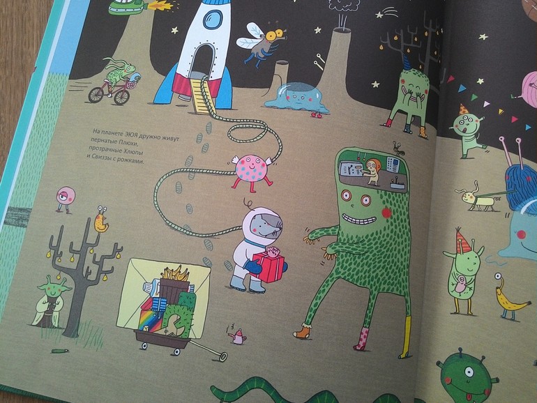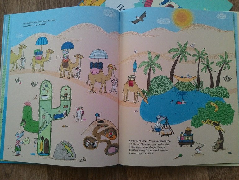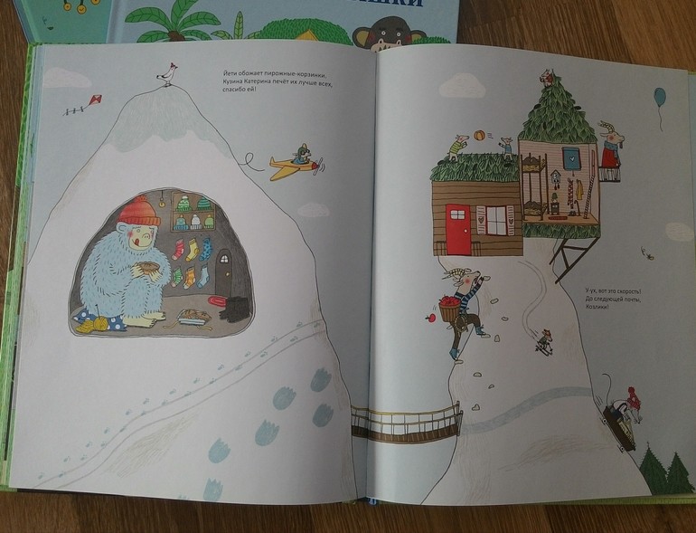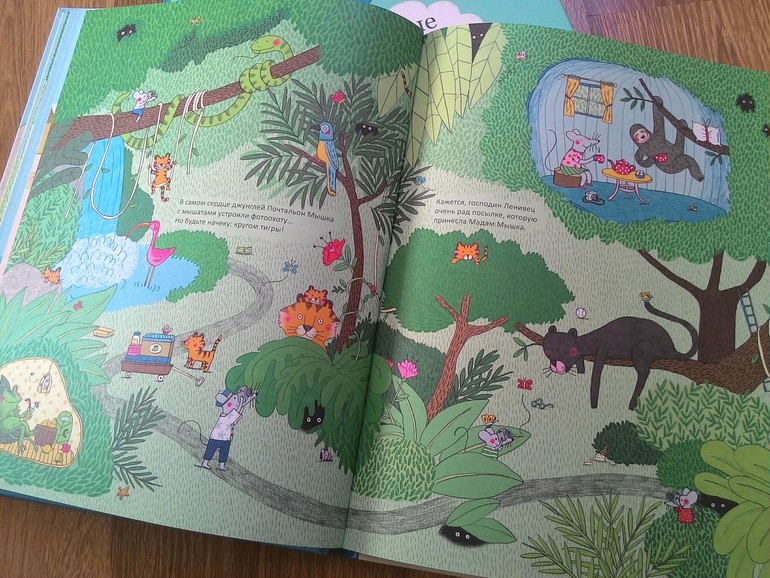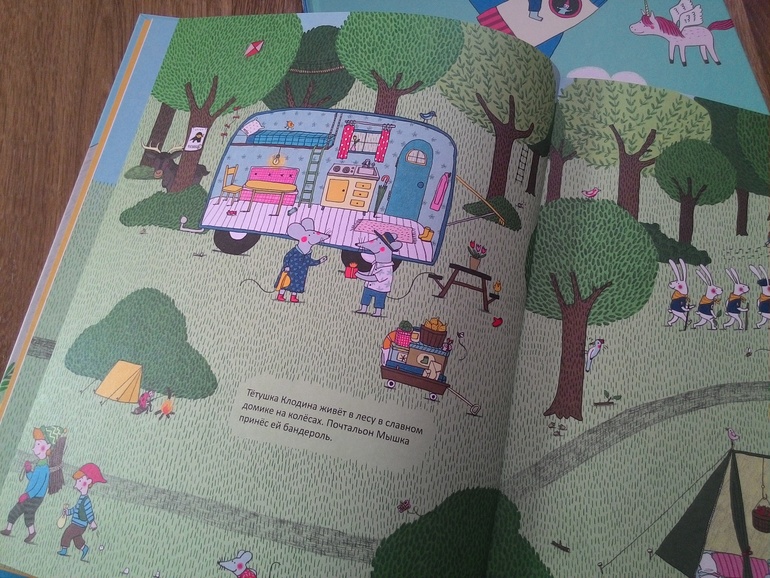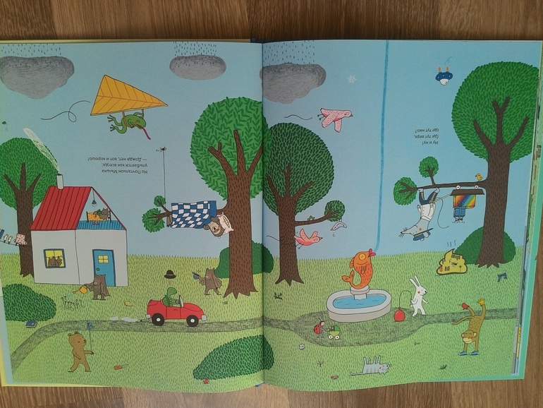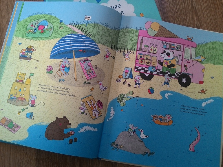 Хотя вернее будет начать с того, что это по сути виммельбухи. Три разных с одними и теми же героями. Текста немного, зато много картинок, разных мелочей, заданий и фантазии. Огромный размер, но нет мельтешения перед глазами - всё нарисовано аккуратно и по-детски. Наверное, именно "детскость" и простота иллюстраций в первую очередь привлекает внимание. И детали, детали, детали - неизменная черта виммелей!