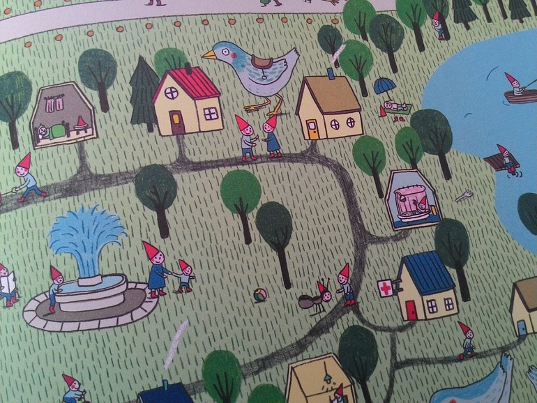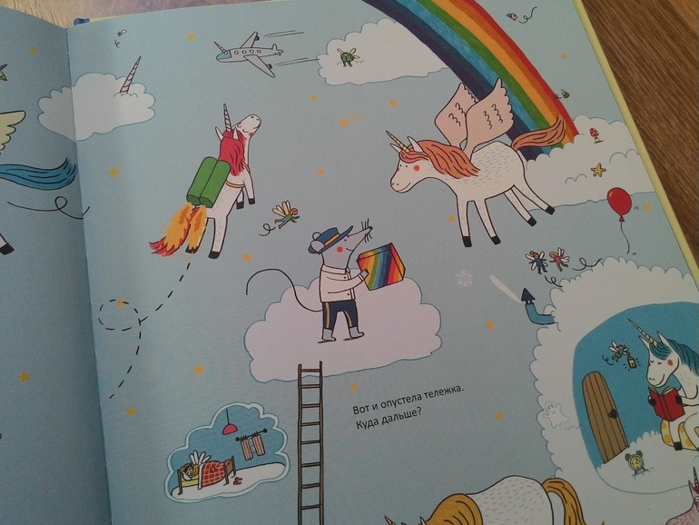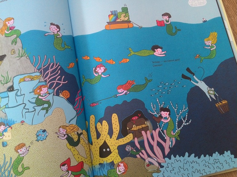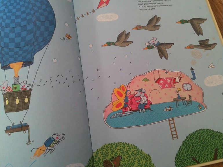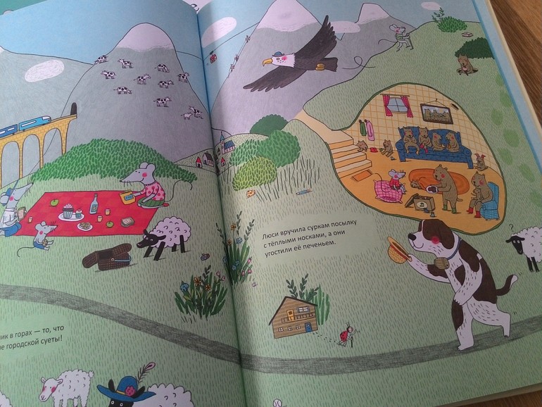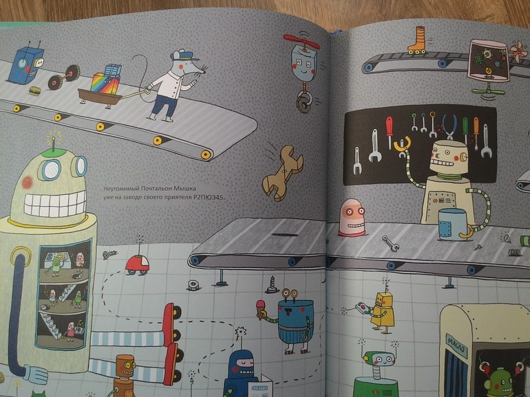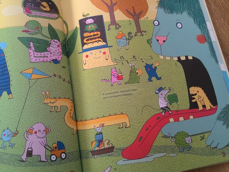 Хотя вернее будет начать с того, что это по сути виммельбухи. Три разных с одними и теми же героями. Текста немного, зато много картинок, разных мелочей, заданий и фантазии. Огромный размер, но нет мельтешения перед глазами - всё нарисовано аккуратно и по-детски. Наверное, именно "детскость" и простота иллюстраций в первую очередь привлекает внимание. И детали, детали, детали - неизменная черта виммелей!