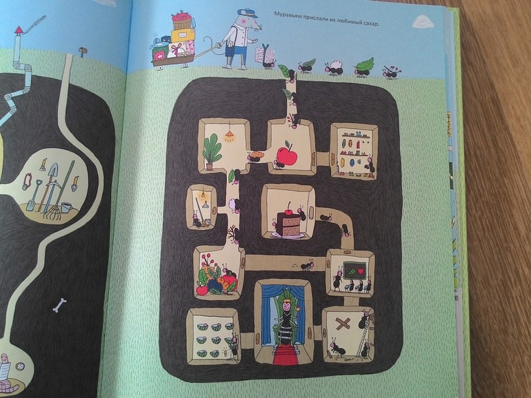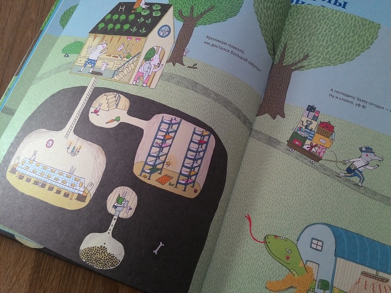 У кроликов дом большой! Под землей тоже есть комнаты. И даже туалет. Вообще стоит отметить, что в современной зарубежной иллюстрации туалетная и какашечная тема встречается достаточно часто. Для меня поначалу это было странным - ну не обязательно же прям всё показывать!.. Но художникам виднее - у детей юмор немного другой, и им такие картинки ой как нравятся. Поворчала я немного, да успокоилась! Но не смирилась - в других книгах этого не пропущу.