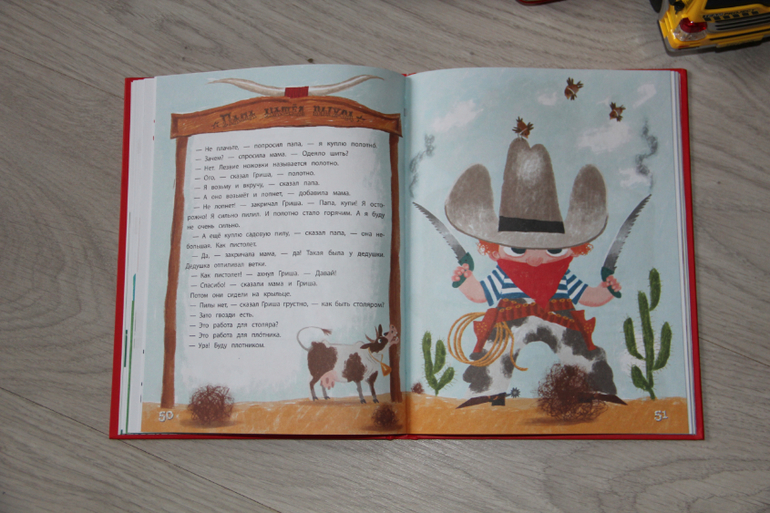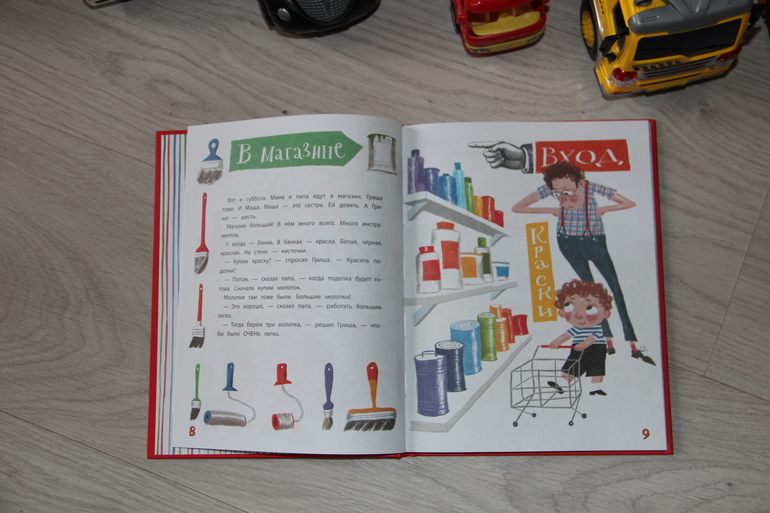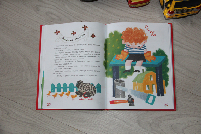 Мальчик Гриша захотел стать столяром, они с папой, мамой и старшей сестрой Машей (что для нас немаловажно, так как у нас старшая девочка и младший мальчик) едут в магазин за инструментом, потом за досками к бабушке, а потом первые неудачи (доска не пилится) и успехи, взаимоотношения. Очень интересная книга.
