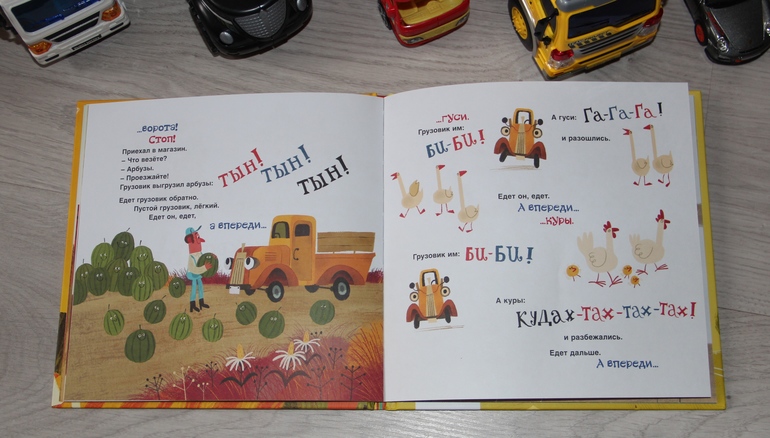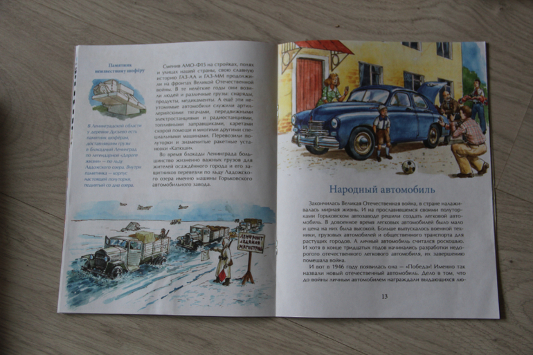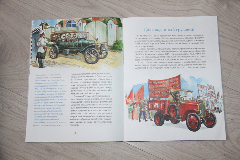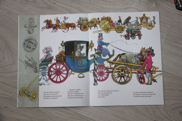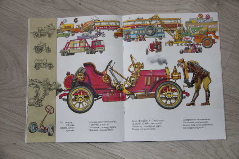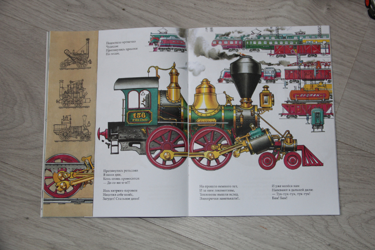 Еще одна чудесная книжка не только про историю автомобиля. А про то что колеса есть еще и в часах, и в гончарном круге, и в заводских станках. Стих по моему мнению только дополнение, основное это иллюстрации, они просто шикарные. Я вот после этой книги захотела модельку старинного паровоза, вот такую как на картинке, ах...