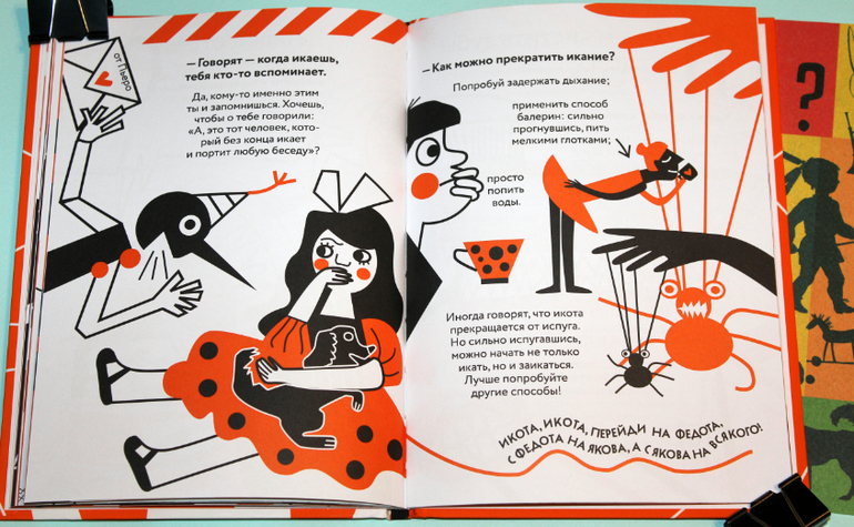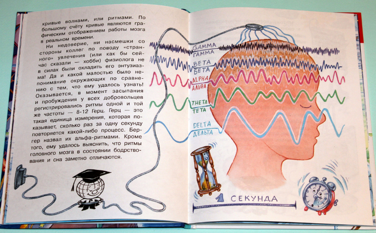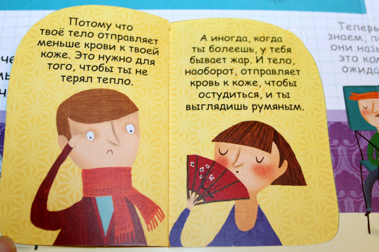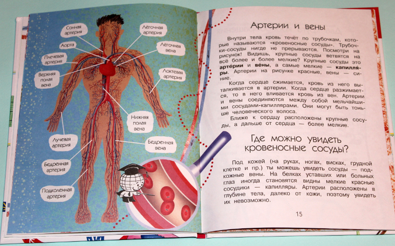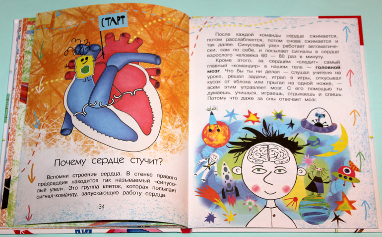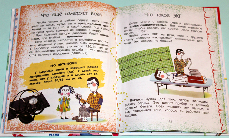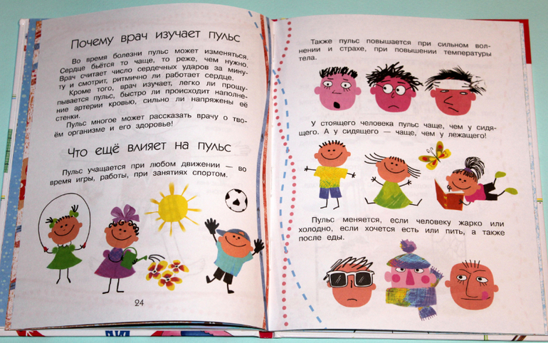 Много картинок в книге, которые помогают понять прочитанное. Целых четыре разворота занимает тема "Пульс". Сначала рассказывается, что это такое пульс. Потом идет обучение, как и где его найти. Так же автор рассказывает, какую информацию получают доктора, когда измеряют пульс. Из-за чего может учащаться и замедляться пульс. И под конец учимся измерять пульс.