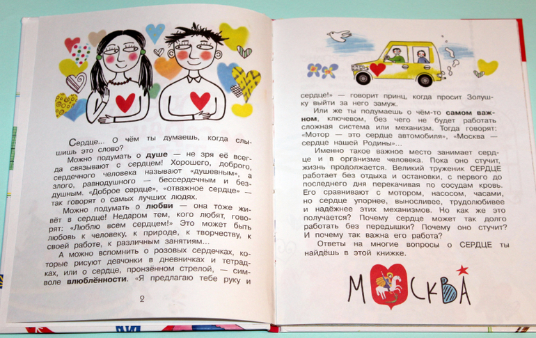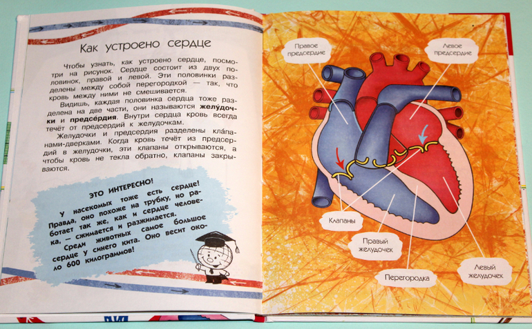 Рассказывает где находится сердце, что его защищают рёбра. Понравилось сравнение сердца с птичкой в клетке). Подробно рассказывается о строении сердца и его работе. Кровь, сосуды, артерии, вены, описана вся кровеносная система.