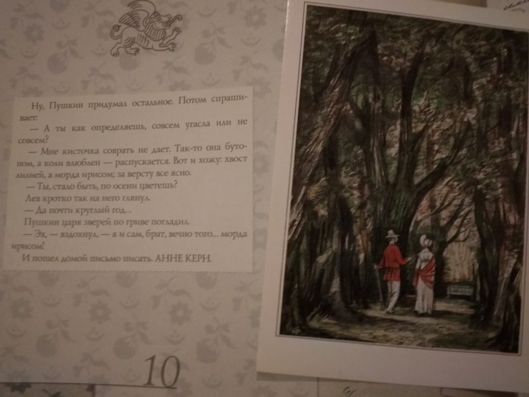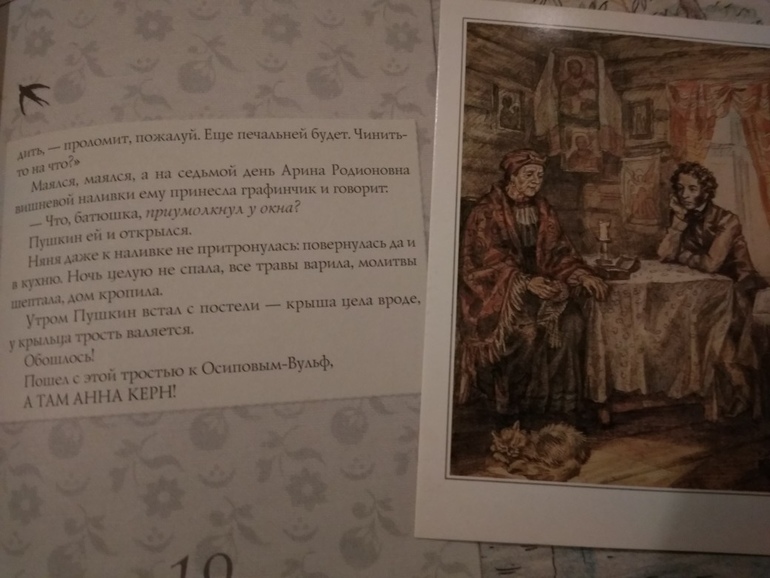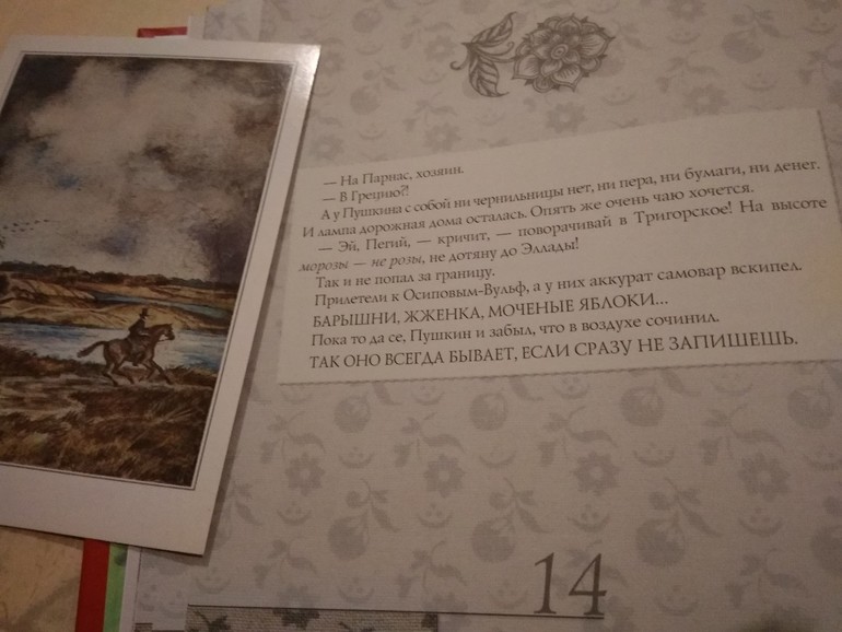 Это не хлеб и не масло литературоведов, биографов и историков. Это - воздух пушкинской поэзии, легкий аромат чая, заваренного няней, рубиново-красный солнечный блик от графинчика с наливкой, это треск и гудение пламени в печи, это шуршание листьев за окном и ветер, колышащий занавеску... Это пойманное в атмосфере Пушкиногорья настроение, легкими строчками занесенное на рассыпанные по письменному столу листы бумаги. Настроение, которое можно поймать, только прекрасно зная Пушкина, его жизнь и творчество, когда к любому образу и ситуации легко всплывает цитата - поэтическая строка, строчка статьи, заметки или письма, и каждое слово рождает ассоциации, связанные с ним.