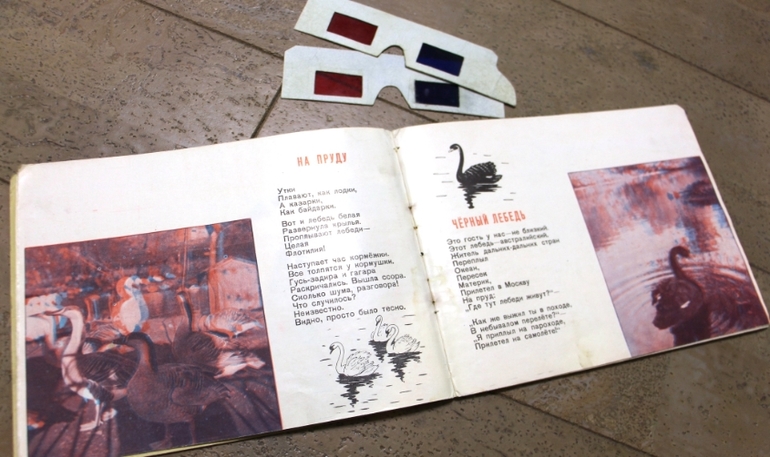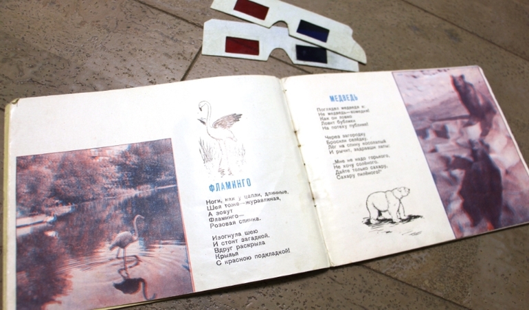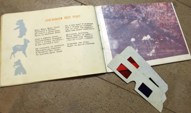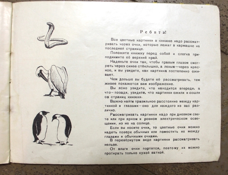 Совершенно замечательная и непривычная книжка: формат А5, страницы на меловке. Обложка из толстого картона, а корешок из такой ткани похожей на клеенку (как советские карточки в поликлиниках). И, о, чудо! В маленьком кармашке 3Dочки. Точно такие они и сейчас, спустя почти 60 лет. Не знаю как вы, а я ооочень удивилась.