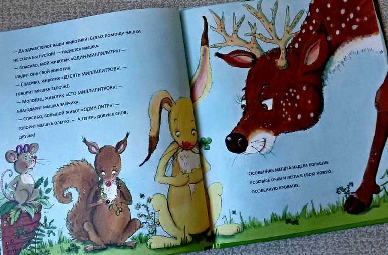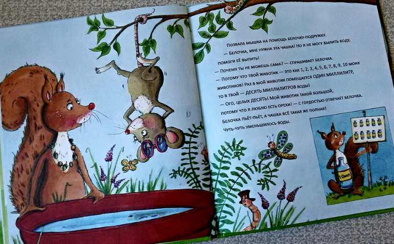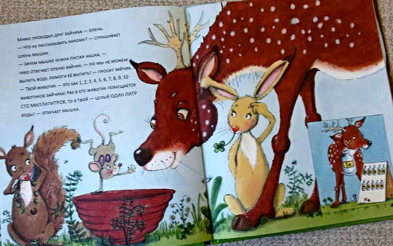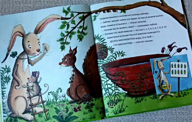 Чтобы сделать мышке необычную кроватку, животным предстояло освободить от воды найденную чашку. Для этого каждому нужно было из нее отпить столько воды, сколько помещалось у них в желудке. В животик мышки поместилась всего лишь одна капля - один миллилитр. Животик белочки в 10 раз больше, чем у мышки и в него помещается десять миллилитров воды. А животик зайки в 10 раз больше, чем у белочки…