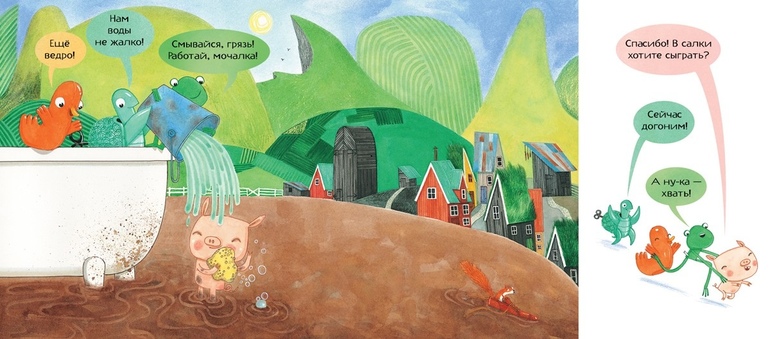 Когда все ушли, и дома никого нет, три игрушки из ванной комнаты - черепашка, лягушонок и уточка - наполняют ванну водой и спешат на помощь зверям. У кенгуру жажда, у пчелы завяли цветы, у сома пересох пруд, а у павиана в саванне - пожар! У спасательной команды так много дел - успеют ли они к вечеру вернуться домой для самого важного дела?