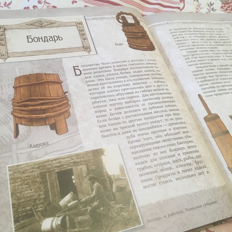 Первая - энциклопедичная. 34 разворотов рассказывают о 34 профессиях и занятиях- бондарь, пасечник, кожемяка, охотник, скорняк, смолокур, табунщик и многие другие.