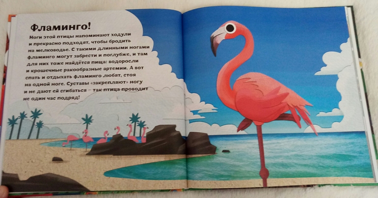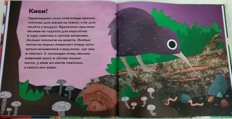 Птицы и букашки :от носа до хвоста автор Стейси Родерик , художник Квантяй Мория. Необычная книга- перевертыш для юных любознательных орнитологов и энтомологов! И еще это интерактивная книга- игрушка, которая предлагает немного поиграть, поугадывать) Сначала видим какую нибудь, самую выдающуюся часть птицы или букашки, а на следующем развороте следует разгадка и немного интересных, и порой забавных, фактов.