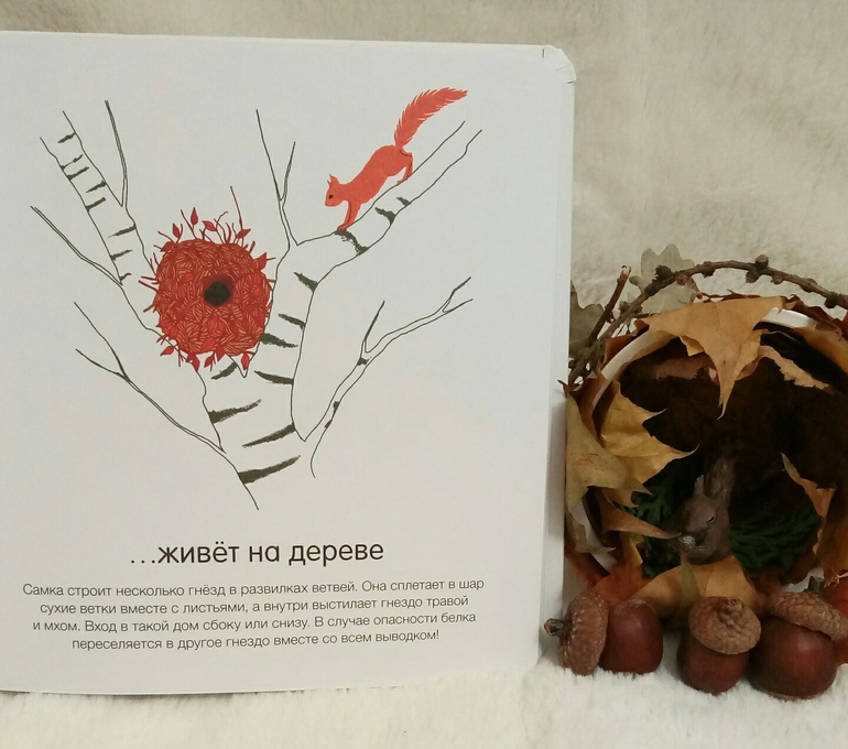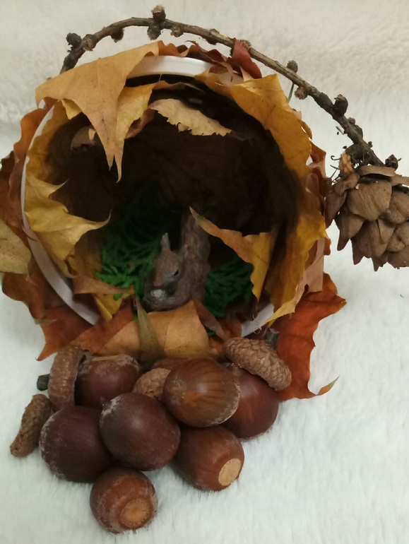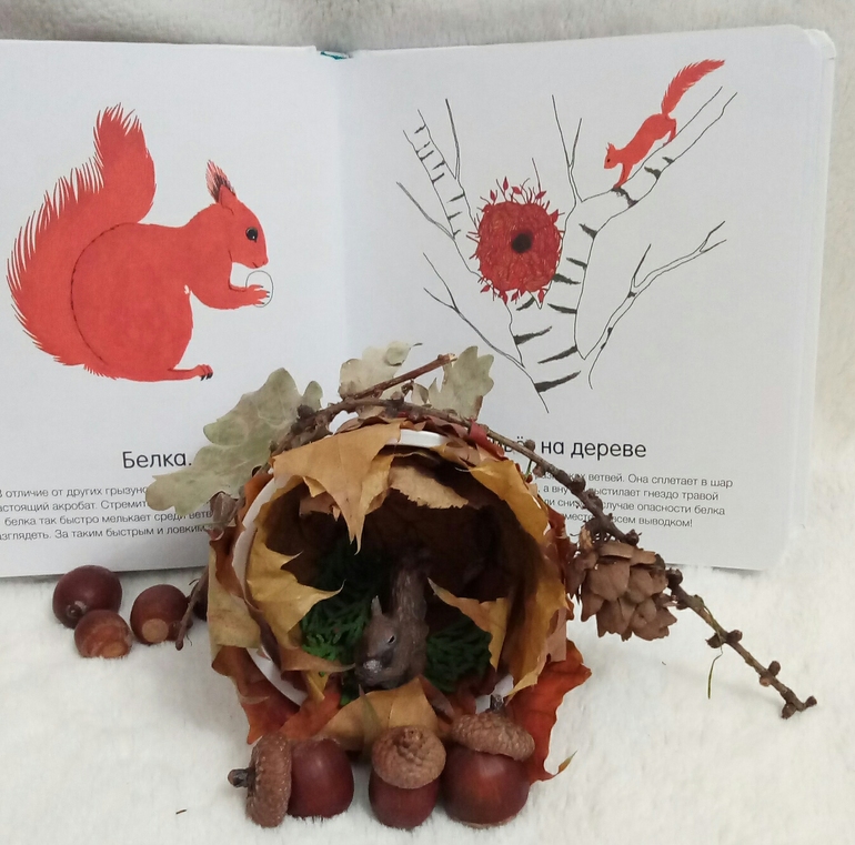 Чего, чего, а листвы в доме сейчас полно, каждый день с букетами домой приходим) Поэтому дупло для белок сделали без труда)