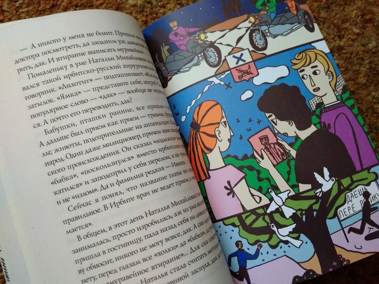 Как же повезло маленькому уральскому городку с его сохраненным кирпично-двухэтажным историческим центром! Ведь жители, приходя на прием к врачу, даже не подозревали, что карточку им заполняет историк и летописец их родного города, который увековечит его улицы, дома и огороды, заводы и мельницы, площади и памятники, а так же их самих в своей повести. Сколько же в ней героев! И школьники, и учителя, и врачи, и слесари, и артисты, и милиционеры, и пенсионеры. И даже мотоциклы с собаками. Да-да, пес Мотя (вслушайтесь и оцените это имя!) в мотоциклетной каске сделанной из половинки пластмассового детского мячика, восседающий в коляске мотоцикла по имени Рогатка (да, даже мотоциклы в городе, где выпускают это чудо на колесах марки "Урал", имеют имена) - это такой же полноправный герой повести.