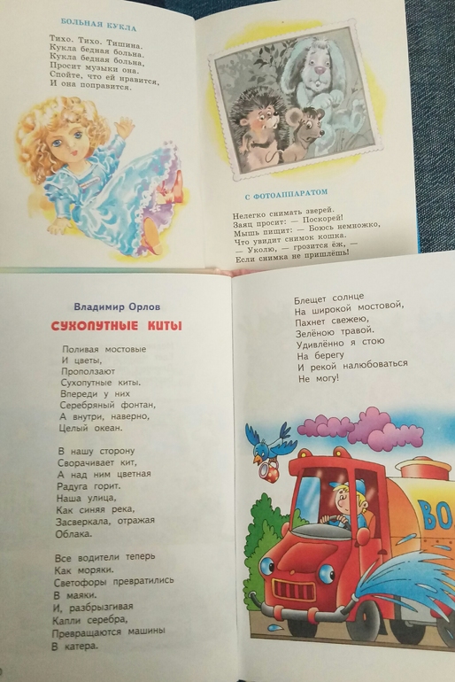 Второй сборник, не смотря на не самые удачные рисунки, тоже оочень любим и выучен наизусть! да и как иначе, если он про трнспорт, самый самый разнообразный! Видим поливальную машину, сразу цитируем Поливая мостовые и цветы, проползают сузопутные киты. Очень любит Дядину про лимузин и таксу, все, что длинное встречает, у него все длиннннное как лимузин) и конечно, любит Орлову про каток) да, про Орлову)