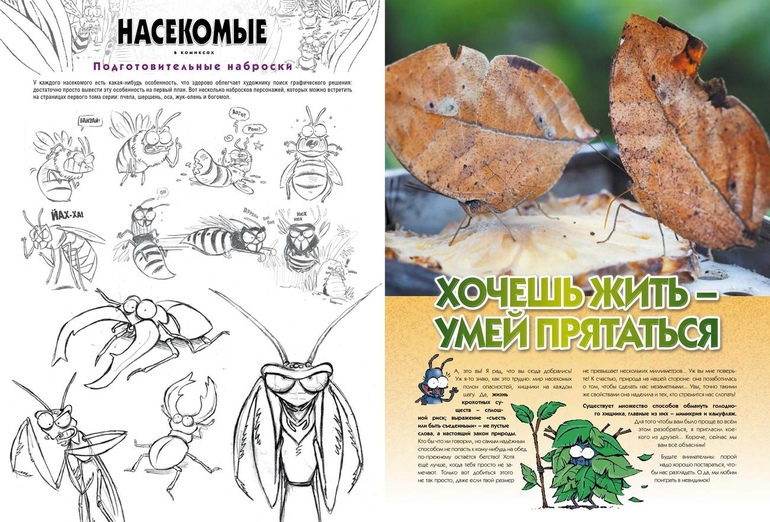 Но и это ещё не всё! Завершает книгу подробная лекция на такую, прямо скажем, животрепещущую для насекомых тему, как мимикрия и камуфляж. Важно отметить, что авторы не стали городить отсебятину, и в качестве основного спикера пригласили специалиста - муравья, который подошёл к делу со всей ответственностью и даже позвал на подмогу своих друзей, настоящих профессионалов: голубянку, берёзовую пяденицу, грязного хищнеца, листовидку и многих, многих других. Уж кто-кто, а они своё дело знают!