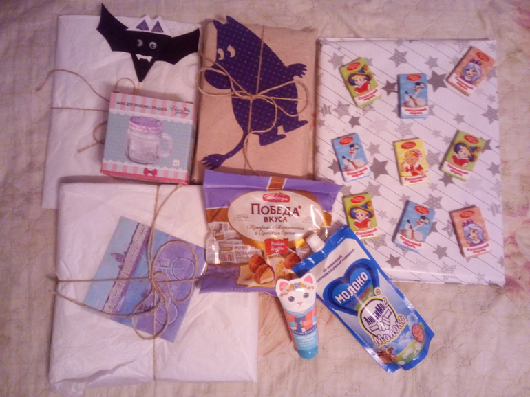 Люба, я очень рада, что все понравилось. Я первый раз собирала посылку-презент искушенному в книжных делах человеку))). Было очень трудно)). Мне казалось, что у тебя уже всё есть). Гадала на какие книги мог ещё не упасть твой орлиный взор. Сущёночка это омского производителя, так сказать местный гостинец)). Не знаю какие ты любишь конфетки, а это мои любимые от "Победы", поэтому я купила себе и тебе упаковочку)))). Пока твои к тебе ехали, мои уже исчезли)))). Шоколадки эти очень любимы нами, они вкусные и "сказочные". Я распотрошила все коробки в магазине, чтобы выбрать с разными героями, а то в этот раз одни гуси попадались, Буратино вообще только одного поймала))). Баночку с ручкой тоже тебе и себе купила, такие они миленькие мне показались. Я брала для варенья, но Ильдарчик туда складывает орешки и мелкие конфетки скитлс))). Остер это наш, мы решили поделится и частичкой нашей домашней библиотеки, ты же говорила, что у вас нет Остера, вот вам на пробу, нам он нравится).