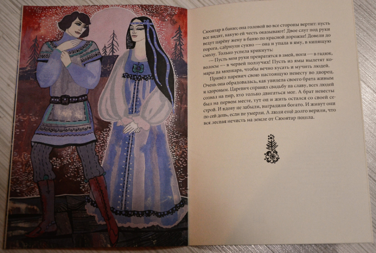 Мне иллюстрации очень нравятся. Сама книжка тонкая, на скрепке. Сказка про брата с сестрой и злую ведьму Сюоятар. Покажу фото.