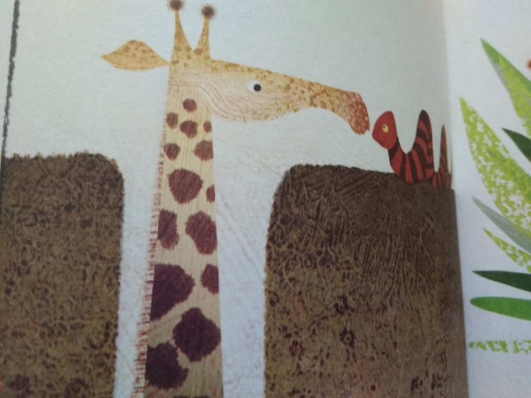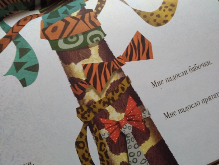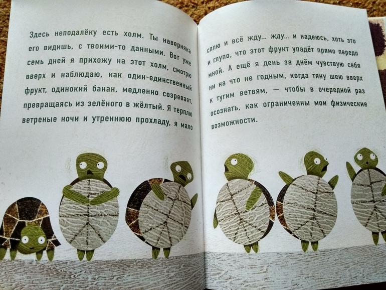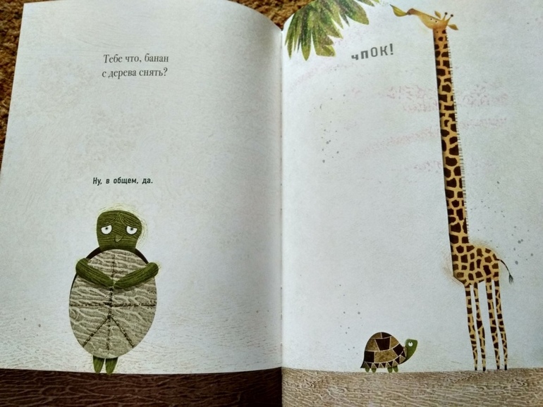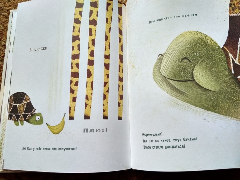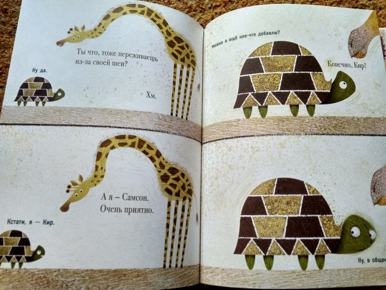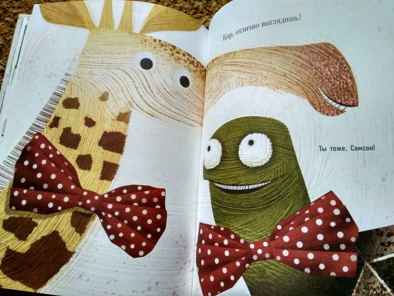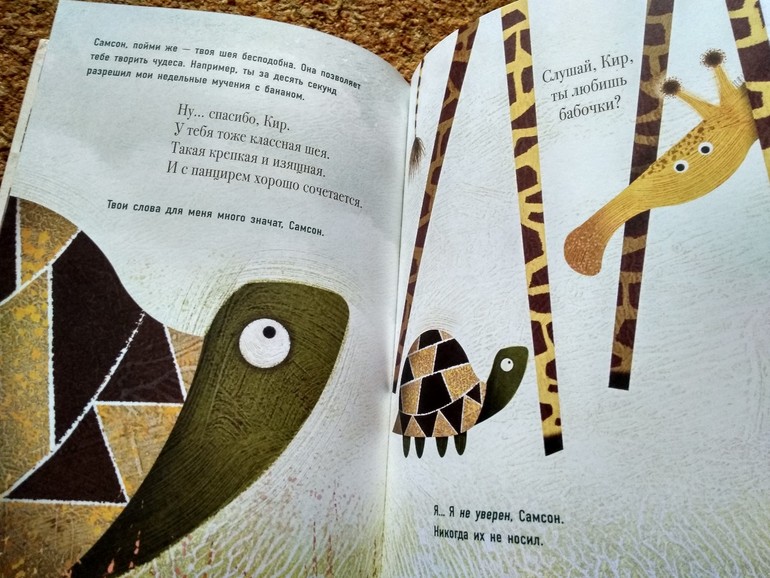 В книге вообще нет авторского текста - сначала длинный монолог Самсона с его экзистенциальными затыками переживаниями, а затем диалог черепахи и жирафа. Очень неплохой вариант для театральной постановки с детьми. Думаю, что наибольший ажиотаж вызовет шмякнувшийся сверху к ногам Кира банан )))) Можно еще поучиться галстуки завязывать - по-моему очень востребованный в жизни навык ))