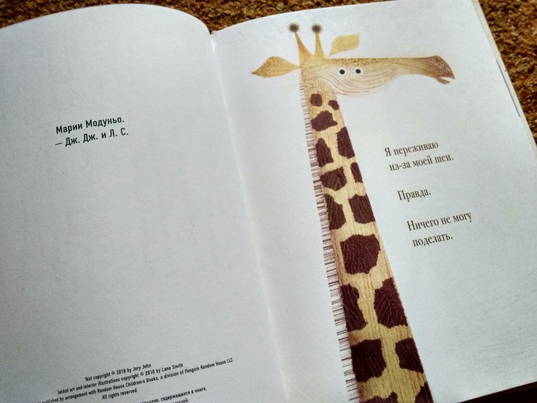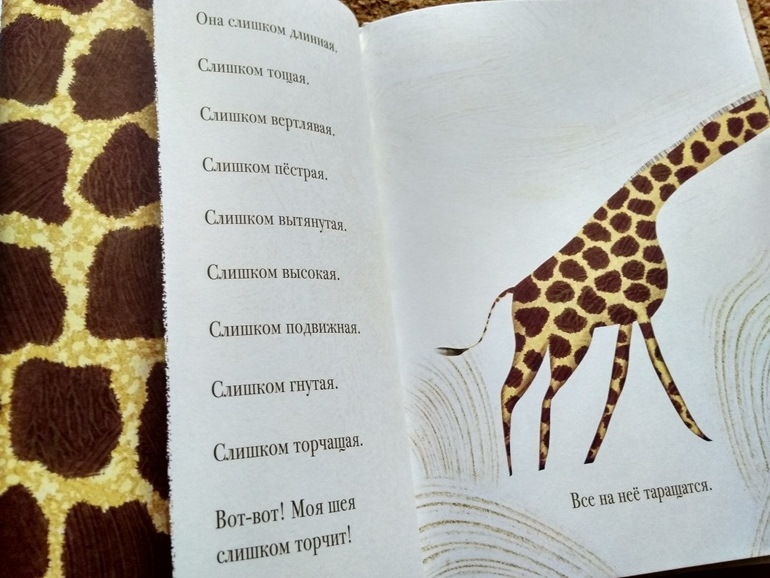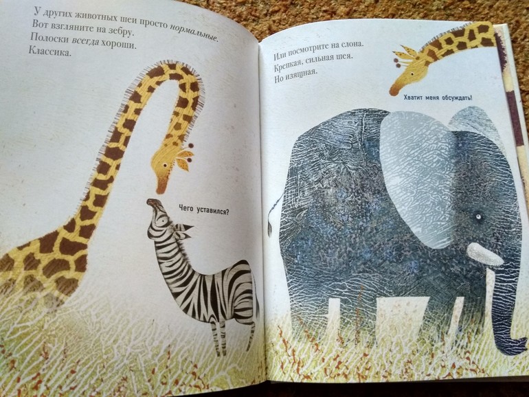 Значит, история про жирафа Самсона, которого очень смущает его длинная шея. Вместо того, чтоб радоваться, что ни у кого такой нет и хвастаться ею напропалую всем встречным-поперечным, он бубнит и ноет, страдая комплексом "белой вороны"...