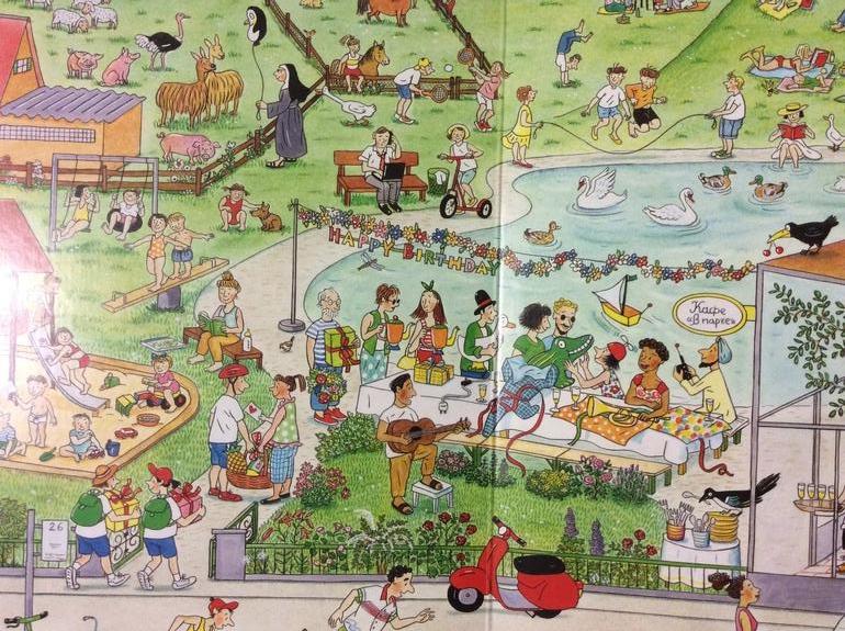 И без текста: друзья Сузанны пришли поздравлять её с Днём рождения. Кто-то даже принёс одинаковые подарки). Действие происходит в Летней книге Ротраут Сузанны Бернер.