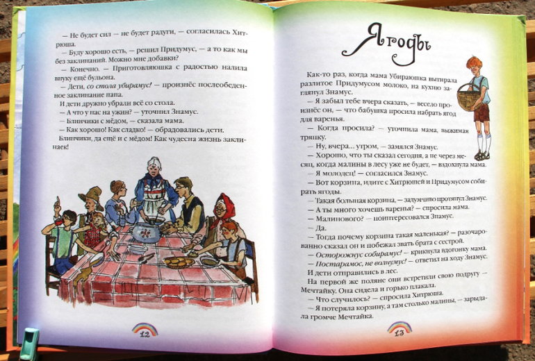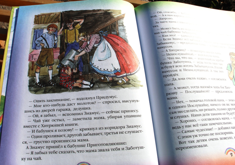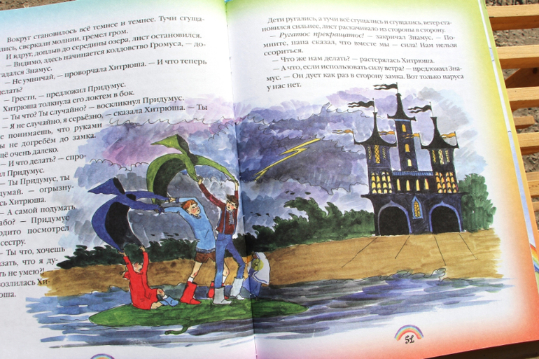 Книга очень спокойно и ласково рассказывает о семье волшебников, живущих в волшебной стране. Они придумывают добрые заклинания и дарят людям разноцветную радугу. Наверное, радуга это самый явный образ для счастья и радости. Ведь действительно, каждый человек поднимет голову и посмотрит на радугу и всегда при этом улыбнется - может и правда она волшебная? И ведь действительно, радуга по волшебству появляется среди темных туч и радует.