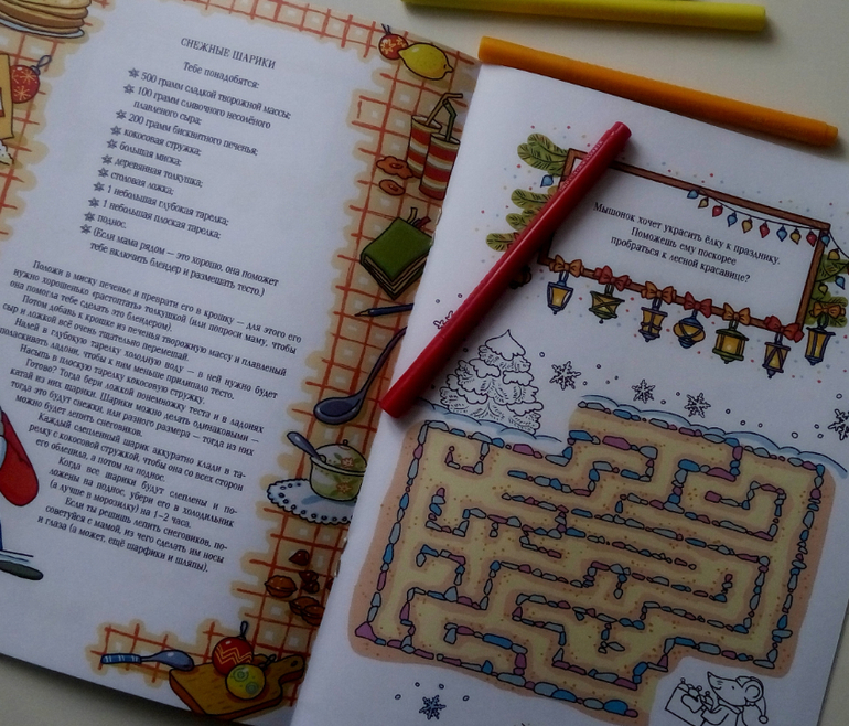 А еще кроссворд, мини-викторина, поделки (открытка и снежинки), зашифрованное послание, фанты, календарь, и даже настоящий рецепт "снежных шариков"!
