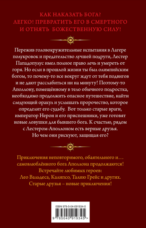 Итак, Аполлона лишили божественной силы, заставили пройти смертельно опасный квест в Лагере полукровок и бросили одного на произвол судьбы, - но на этом его испытания еще не закончились! Чтобы вернуться на Олимп, Лестеру Пападопулусу (то есть несравненному Аполлону, конечно!) предстоит отправиться на поиск следующего оракула, который не только предопределит его судьбу, но и повлияет на жизнь его близких друзей. Однако чтобы добраться до него, бывшему богу придется взглянуть в глаза своим страхам и встретиться со старыми врагами, которые больше всего на свете хотят убить его. На что же готовы пойти Аполлон и его друзья, чтобы выполнить свою миссию?