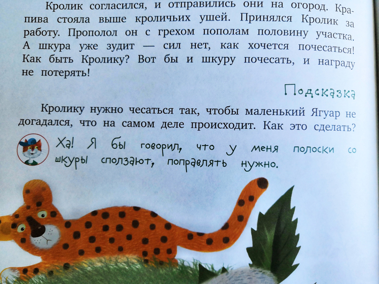 Пообещал ягуар тому, кто прополет его огород, заросший крапивой, отдать целую корову. Вызвался кролик выполнить эту работу. А ягуару вдруг жалко стало отдавать награду, вот он и придумал хитрость: нужно вырвать всю крапиву и ни разу при этом не почесаться. Смотреть за выполнением условия приставил своего сына. Кролик согласился. Прополол половину и сил больше нету, зудит шкурка, очень хочется почесаться. Как же кролику шкуру почесать и награду при этом не потерять?