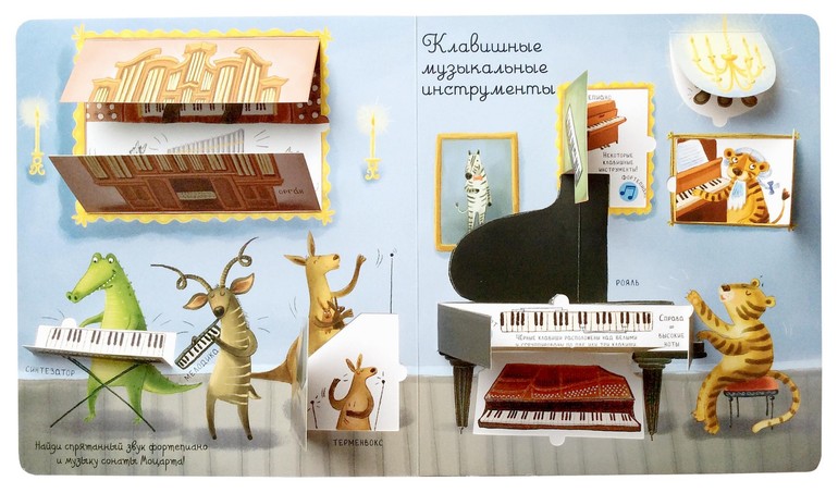 Под окошками этой необычной музыкальной книги скрыто много интересных фактов и красивых мелодий, с помощью которых ваш малыш узнает:
