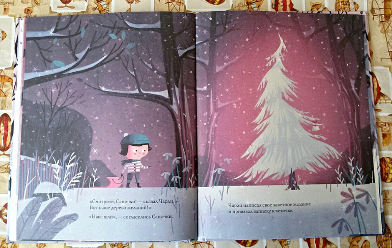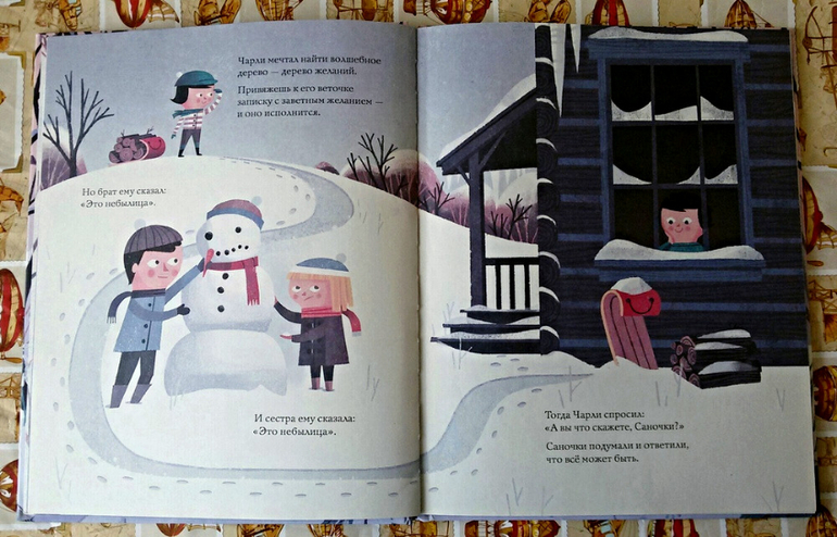 Сюжет книги предельно прост - мальчик Чарли мечтает найти волшебное дерево - дерево желаний. Он берет свои саночки и оправляется в лес на поиски. По пути он помог довезти белочке орешки до дома, а бобру донести наломанных палочек для плотины.