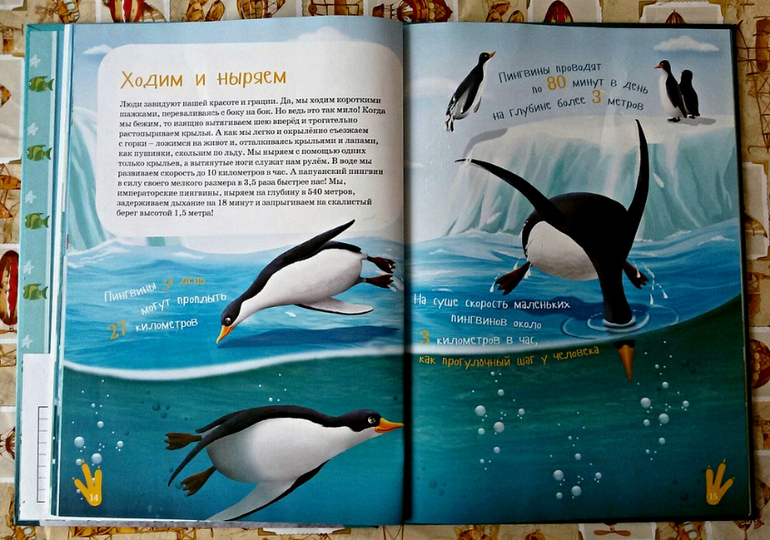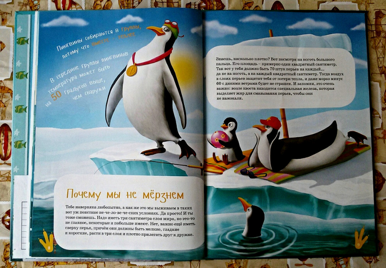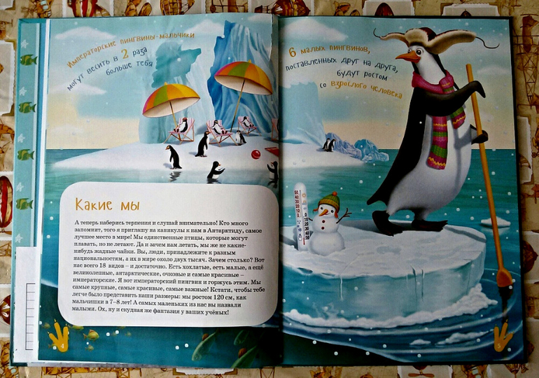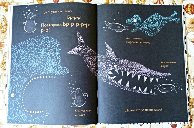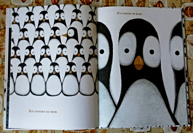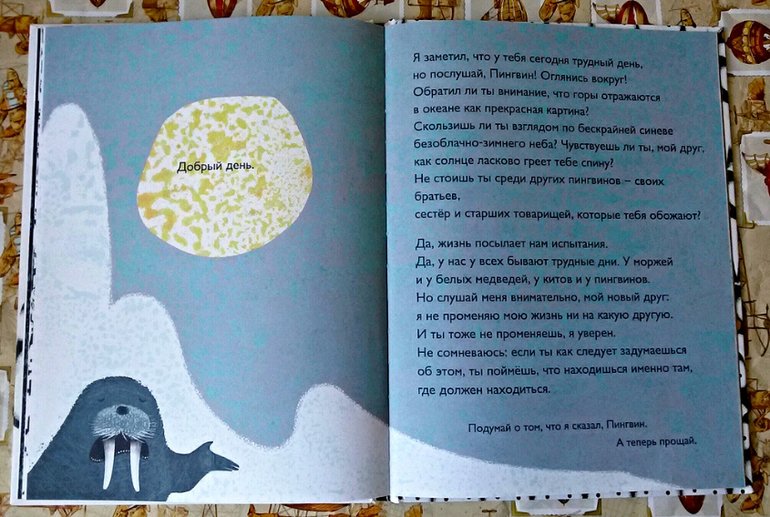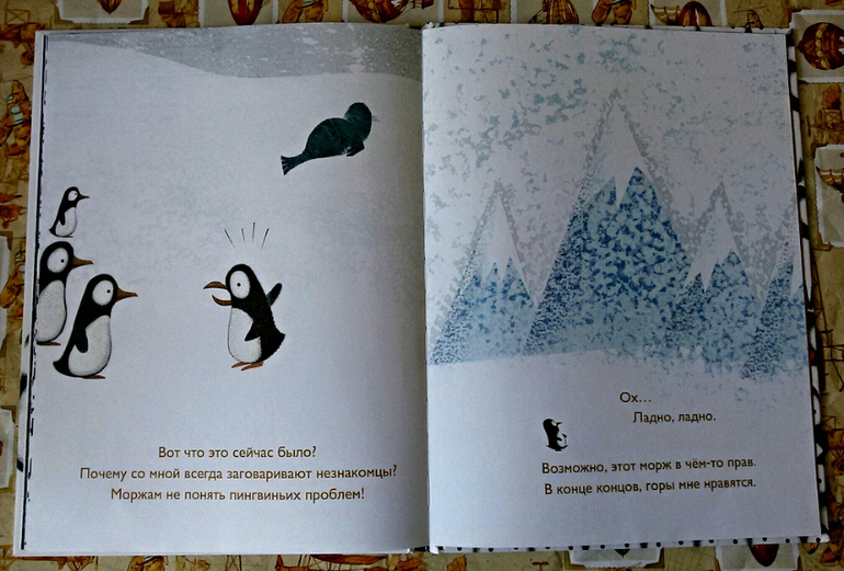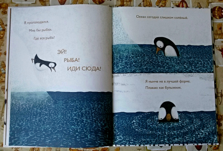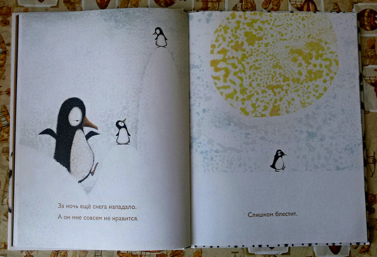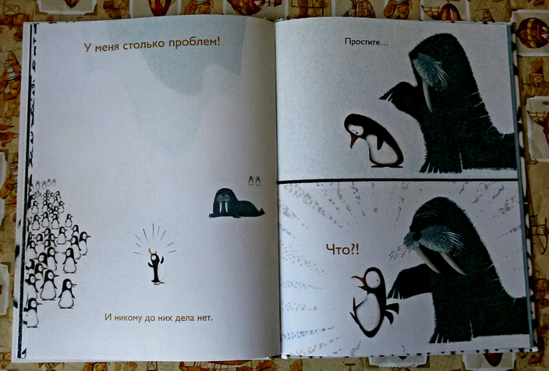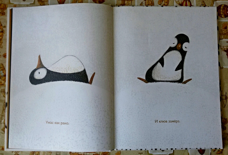 Текста в книге мало, одно-два предложения на разворот (если не считать речь моржа о том, что жизнь прекрасна на целую страницу). Но удрученно-депрессивное настроение пингвина она описывает очень точно. Бывают дни, когда я такой же букой хожу по дому и все меня раздражает.